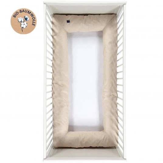 Doch nicht nur in dieser Situation ist die kuschelig weiche Umrandung ein toller Helfer: Im Elternbett kann damit ein eigener geschützter Bereich für Dein Baby geschaffen werden, aber auch während dem Spielen eignet es sich als praktischer Schutz. Mit einem Gesamtumfang von ca. 420 cm ist das Nestchen Carré für Bettchen mit den Maßen 70 x 140 cm passend. Der Bezug besteht aus kuscheliger Bio-Baumwolle und ist so ideal für die zarte Babyhaut. Die flauschige Füllung im Inneren macht es angenehm weich.