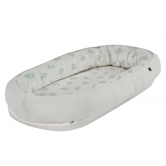 Die weiche, hohe Umrandung sorgt dafür, dass Dein kleiner Liebling sicher liegt und spendet ein Gefühl von Geborgenheit. Das bezaubernde Design Teddy 1961 in schönen Grüntönen mit süßer Teddy-Musterung lässt das Nestchen schnell zum besonderen Hingucker werden. Der Bezug besteht aus hautfreundlicher Bio-Baumwolle und ist zur zarten Babyhaut besonders sanft.
