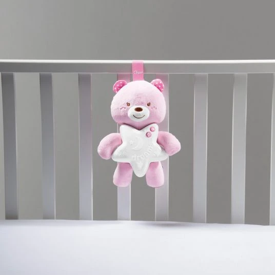 Die Spieluhr mit Nachtlicht – Gute Nacht Bärchen von Chicco hilft Deinem Baby sanft und geborgen einzuschlafen. Der große leuchtende Stern und die sanfte Melodie strahlen eine besondere Ruhe auf Dein Baby aus. Nach 10 Minuten einer Auswahl an klassischer Musik oder Naturgeräuschen (Wellen, Vogelgezwitscher, Frühlingsregen) schaltet sich der Stern automatisch ab. Die Lautstärke der Musik kannst Du in 3 Stufen anpassen. Der Teddybär lässt sich mithilfe des Klettbandes ganz leicht am Bettchen, Laufgitter, Babyschale oder Kinderwagen befestigen und kann so überall mit dabei sein.