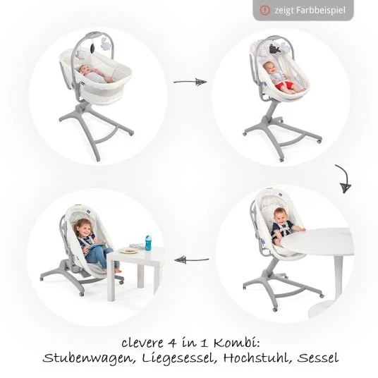 - praktische Kombi: Stubenwagen, Babyliege, Hochstuhl und Sessel in einem