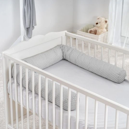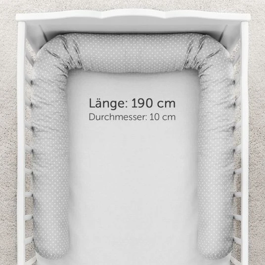 Mit der weichen Bettschlange – Punkte Grau Weiß von Fillikid schützt Du Dein Baby vor den Gitterstäben des Babybetts oder dem Wegrollen auf dem Elternbett. Das Kuschelnestchen wird einfach ausgelegt und muss nicht mühsam befestigt werden. So eignet es sich für Wiegen, Betten und mehr.
