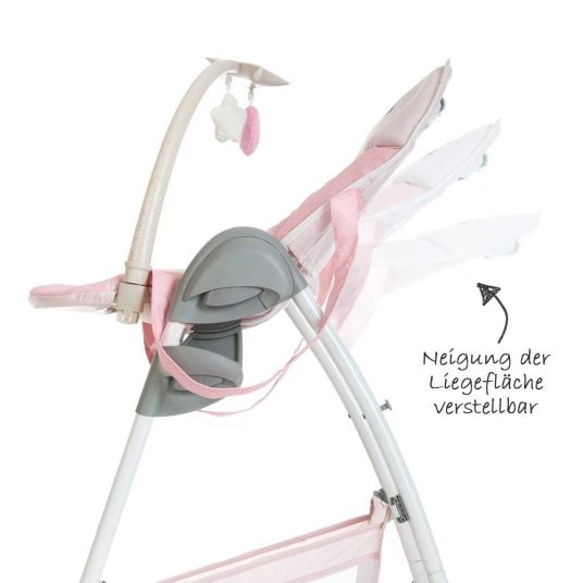 In den ersten Monaten liegt Dein Baby rückenschonend in dem praktischen Babyaufsatz und wird durch den gepolsterten 3-Punkt-Gurt sicher im Sitz gehalten. Die Höhe der Babyliege lässt sich beliebig anpassen und auch die Rückenlehne ist dreifach verstellbar. Der Spielbogen mit den beiden süßen Figuren weckt die Neugierde Deines Kindes und trainiert seine motorischen Fähigkeiten. Es kann zur Seite geschwenkt oder komplett abgenommen werden.
