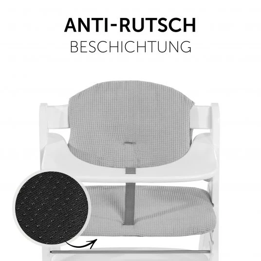 Der Sitzkomfort kommt dabei auch nicht zu knapp: Kuscheliger, angenehmer Baumwoll-Waffelpiqué mit atmungsaktiven und feuchtigkeitsregulierenden Eigenschaften bieten ein angenehmes Sitzgefühl. Die weiche Polsterung der Hochstuhlauflage macht den Hochstuhl besonders bequem.