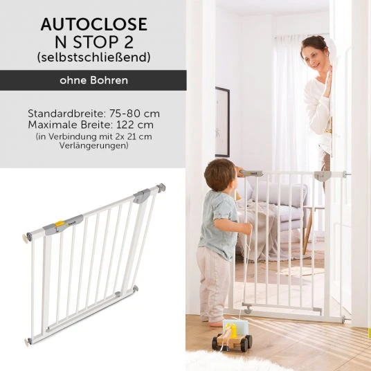 Das Tür- bzw. Treppenschutzgitter Autoclose N Stop 2 schließt dank Magnetverschluss in jedem möglichen Öffnungswinkel automatisch und sicher von selbst. Es ist aus stabilem Metall und für eine Breite von 75 – 80 cm geeignet. Mit Verlängerungen von 9 cm bzw. 21 cm und wahlweise Y-Spindeln kannst Du es bis zu 122 cm erweitern und so auch an runden Treppengeländern verwenden.