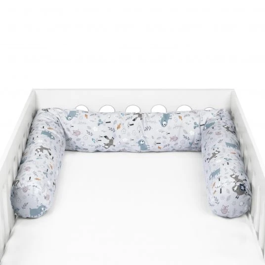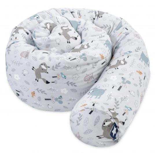 Die bauschige Füllung im Inneren macht sie angenehm weich. Damit es Dein Nachwuchs es in seinem Bettchen oder auch im Laufgitter so richtig gemütlich hat, begeistert die Nestchenschlange mit einer bezaubernden Optik: Das niedliche Muster mit Waldtieren und die sanften Farbtöne laden zum Träumen ein. Wird sie schmutzig, kannst Du sie einfach bei 40°C in der Maschine wieder zum strahlen bringen.