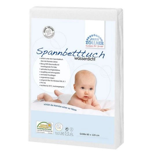 Das wasserdichte Spannbetttuch Weiß von Julius Zöllner sorgt für einen angenehmen Liegekomfort und ist besonders saugfähig und atmungsaktiv. Es wird ganz einfach über die Matratze gespannt und bietet optimalen Schutz für die gesamte Liegefläche. Das Rundumgummi sorgt für einen faltenfreien Sitz. Die Liegefläche besteht aus saugfähiger, weicher Baumwolle, die beschichtete Nässeschutzschicht an der Unterseite hält durch die Feuchtigkeitsbarriere Nässe von der Matratze fern. Das Spannbetttuch ist atmungsaktiv und dampfdurchlässig – so gibt es ein optimales Feuchtigkeitsklima ohne Schweißbildung. Du kannst das Spannbettuch bis 95 °C waschen und so höchste Hygiene für Dein Baby erreichen.