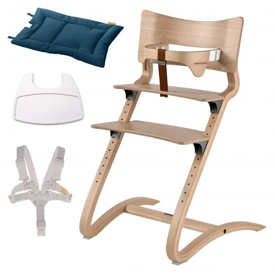- Material: Hochstuhl aus Buche, Sicherheitsbügel aus Buche & Kernleder, Gurt aus Leder, Essbrett aus ABS, Sitzkissen aus 100 % Bio-Baumwolle, Sicherheitsgurt aus Nylon & Kunststoff