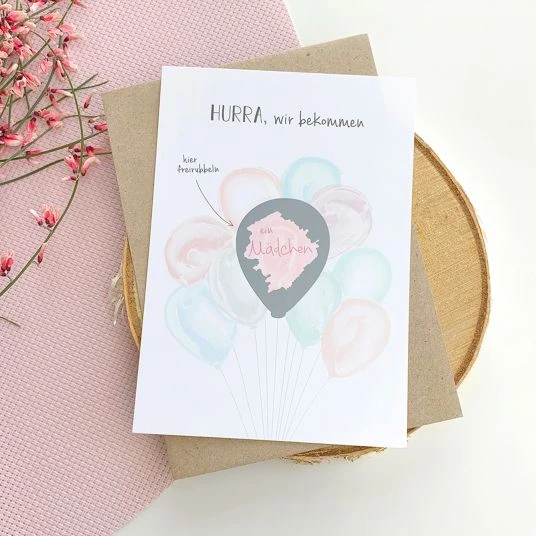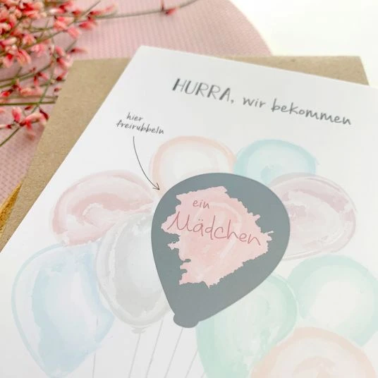 Kaum erfährst Du selbst von der frohen Botschaft des Baby-Geschlechts, möchtest Du das Wissen gerne mit Deinem Partner und der Familie teilen. Mit der Mintkind Baby-Rubbelkarte “Du wirst ein Mädchen” sorgst Du dabei für einen unvergesslichen Moment: Damit Deine Lieben erfahren ob es ein Junge oder Mädchen wird, müssen sie zuerst den silbernen Luftballon auf der Karte freirubbeln.