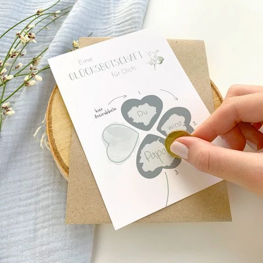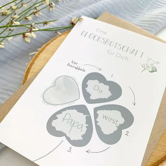 Kaum erfährst Du selbst von der frohen Botschaft zu Deiner Schwangerschaft, möchtest Du das Glück natürlich auch mit Deinem Partner teilen. Mit der Mintkind Baby-Rubbelkarte “Du wirst Papa” sorgst Du dabei für einen unvergesslichen Moment: Damit Dein Schatz von der tollen Nachricht erfährt, muss er zuerst alle 3 silbernen Kleeblätter auf der Karte freirubbeln.