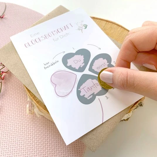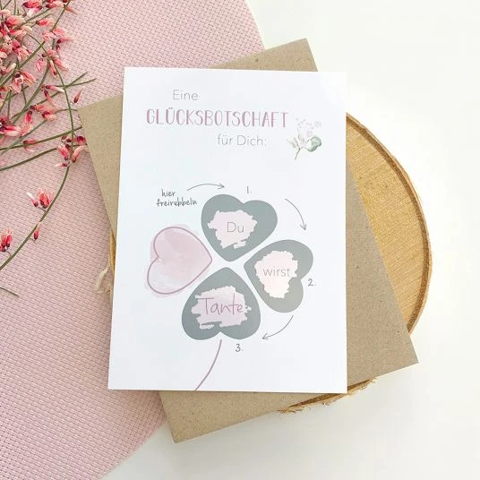 Kaum erfährst Du selbst von der frohen Botschaft zu Deiner Schwangerschaft, möchtest Du das Glück natürlich mit Deinem Partner und der Familie teilen. Mit der Mintkind Baby-Rubbelkarte “Du wirst Tante” sorgst Du dabei für einen unvergesslichen Moment: Damit Deine Schwester oder Schwägerin von der tollen Nachricht erfährt, muss sie zuerst alle 3 silbernen Kleeblätter auf der Karte freirubbeln.