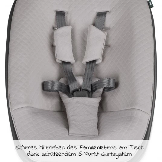 - sicheres Miterleben des Familienlebens am Tisch dank schützendem 5-Punkt-Gurtsystem