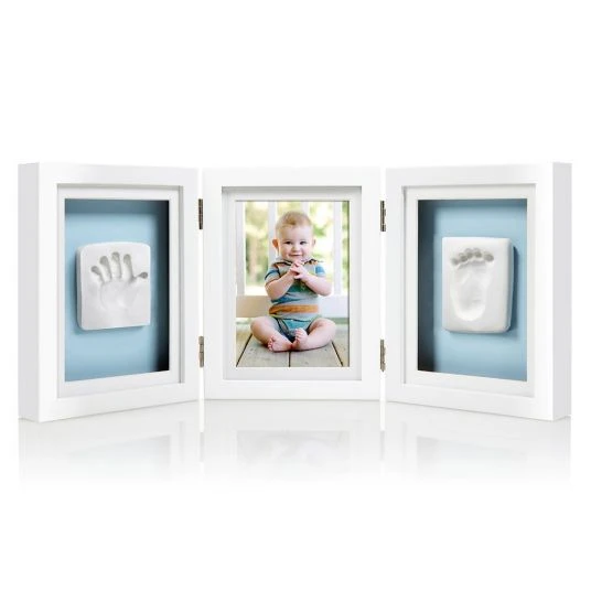 Der Rahmen und das Passepartout sind in edlem Weiß gehalten. Auch ist ein Hintergrund in Blau wie auch in Rosa enthalten. Der Bilderrahmen bietet den perfekten Platz für ein Bild der Größe 10 x 15 cm und zwei Abdrücke. Der Rahmen hat eine Gesamtgröße von 45 x 19 cm. Dank seiner Tiefe von 3,5 cm und der beweglichen Scharniere, kann er problemlos aufgestellt werden.
