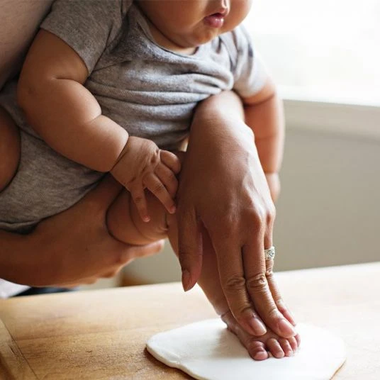 Die luftdichte Verpackung erst kurz vor der Verarbeitung öffnen. Die Masse für ca. eine Minute kneten damit sie schön weich ist. Die Masse dann auf einem Stück Alufolie mit dem beiliegenden Kunststoffroller ausrollen, sodass sie etwa einen Zentimeter dick ist. Befeuchte nun die Hand oder den Fuß Deines kleinen Schatzes mit Wasser und drücke sie kurz in die Masse. Danach lässt Du die Masse zwei Tage an einem kühlen Platz aushärten. Stecke sie dazu nicht in den Ofen.