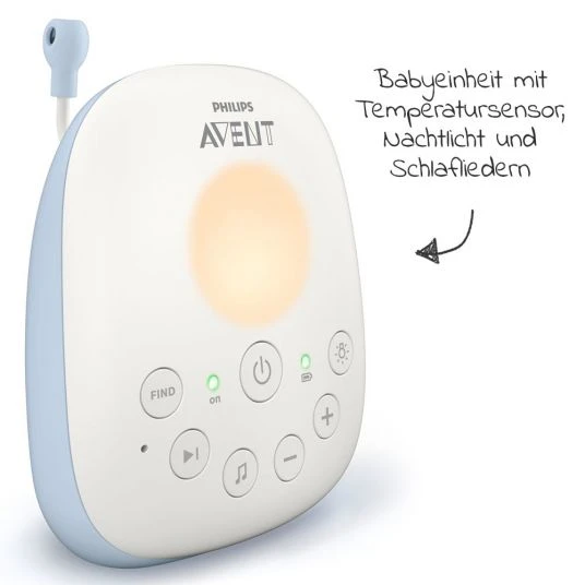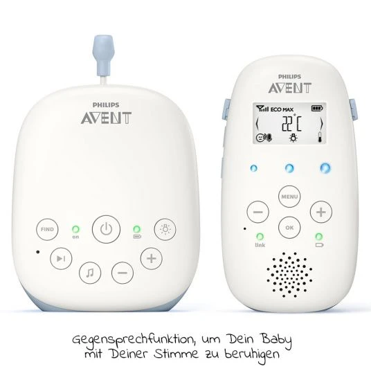 5 Einschlafmelodien und das warme, sanfte Nachtlicht an der Babyeinheit beruhigen Deinen Liebling in der Nacht. Beide Funktionen, so wie die Sprechfunktion, kannst Du von der Elterneinheit aus aktivieren. Mit der Gegensprechfunktion kannst Du Dein Baby mit Deiner vertrauten Stimme besänftigen.