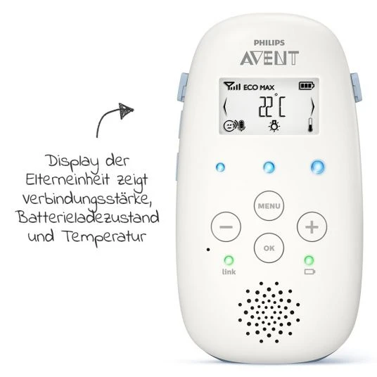 Mit 3 Geräuschpegel-Leuchten am Empfänger siehst Du auf einen Blick, ob und wie laut Dein Baby Geräusche von sich gibt – selbst wenn die Elterneinheit stummgeschaltet ist. Ob Eltern- und Babyeinheit miteinander verbunden sind und ob die Batterien ausreichend geladen ist, wird Dir ebenfalls über Kontrollleuchten angezeigt. Auf dem Display siehst Du außerdem die aktuelle Temperatur im Kinderzimmer. Ein Alarm informiert Dich, wenn eine von Dir vorher festgelegte Temperatur über- oder unterschritten wird.