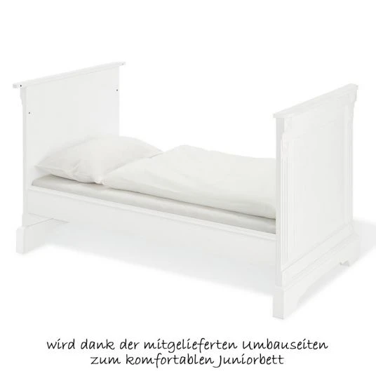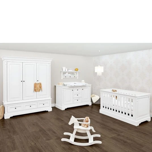 Das Kinderzimmer Emilia von Pinolino besticht durch die aufwendig gearbeiteten Zierleisten und die geschwungenen Sockelelemente. Die edelmatte Lackierung und die Möbelknöpfe aus Metall verbreiten ein edles, barockes Flair. Es besteht aus einem komfortablen Babybett, einer extrabreiten Wickelkommode und einem 3-türigen Kleiderschrank. Damit ist das Zimmerset Emilia eine besonders schöne Spiel- und Schlafumgebung für Dein Kleines.