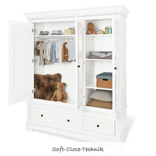 Der weiße Schrank bietet mit insgesamt 6 Fächern und 2 Schubladen viel Platz für Babys Kleidung, Spielsachen und mehr. An einer Kleiderstange kannst Du Schlafsack, Jäckchen und Kleidchen knitterfrei aufhängen und hast so immer alles gut untergebracht. Dank der praktischen Soft-Close-Technik schließen die Türen des Schrankes besonders sanft, sodass Kinderhände nicht eingeklemmt werden und die Benutzung extra leise ist. So wacht Dein Kleines nicht auf, auch wenn Du die Türen mal etwas schwungvoller schließt. Die Schubladen sind mit einem Self-Soft-Close-System ausgestattet und schließen lautlos und fast von selbst.