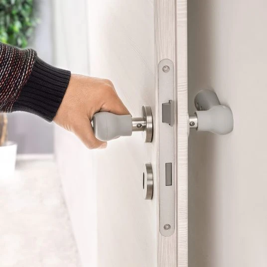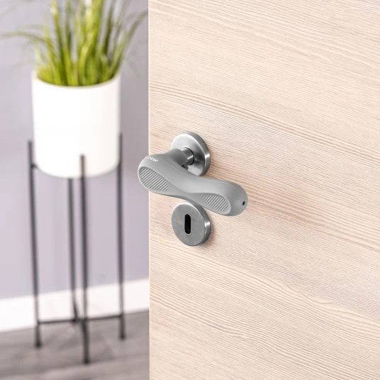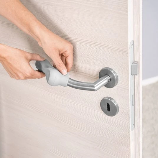 Bestehend aus weichem, flexiblen, BPA-freiem Silikon, federt der Türgriffschutz Stöße ab und ummanteln die Türgriffe komplett. Einfach über den Türgriff gezogen, ist die Anbringung denkbar einfach. Das rutschfeste Silikon sorgt dafür, dass der Schutz zuverlässig auf dem Griff bleibt. Durch die praktischen Maße passt das 2er Set an fast jeden Griff und sogar geschwungene Türklinken. Mit warmen Wasser und mildem Reinigungs- oder Desinfektionsmittel bleibt es hygienisch sauber.