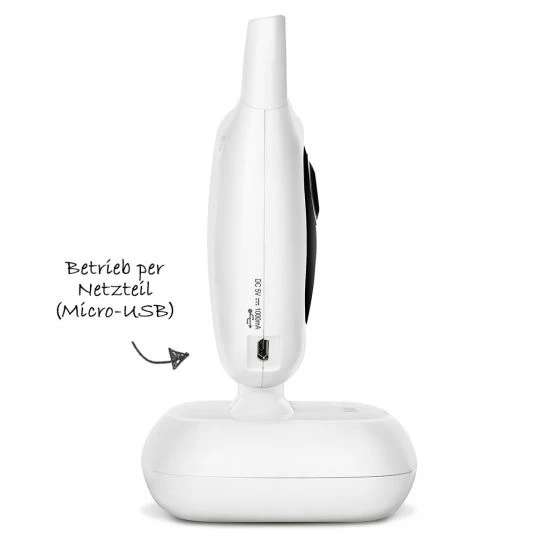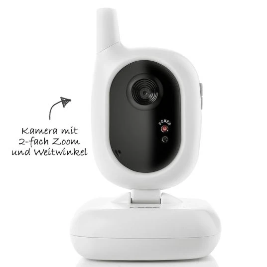 Die 2-fach zoombare Kamera überträgt kristallklare Bilder, unabhängig von den Lichtverhältnissen im Kinderzimmer. Bei Dunkelheit schaltet sich automatisch die Nachtsichtfunktion ein, diese sendet dank der Infrarot-Technologie scharfe Bilder, ganz ohne den Schlaf Deines Babys zu stören. Im intelligenten VOX-Modus schaltet die Babyeinheit die Übertragung von Ton und Bild ab und aktiviert sie wieder sobald Geräusche wahrgenommen werden. Hierfür kannst Du die empfindlichkeit des Mikrofons individuell einstellen. Die flexibel aufstellbare Kamera hat einen Neigungswinkel von 35 Grad nach Vorn und Hinten, so kannst Du Sie mit optimaler Sicht auf Dein Baby einstellen. Eine im Fuß integrierte Halterung ermöglicht die sichere Befestigung an der Wand, so kann die Kamera auch direkt über dem Bettchen angebracht werden.