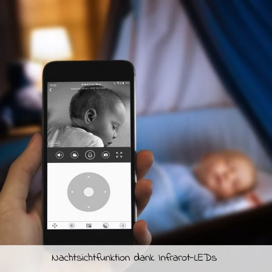 Damit Du Dein Handy oder Tablet mit der Kamera verbinden kannst, muss vorab eine kostenlose App heruntergeladen werden. Mit der App können sogar mehrere Kameras mit Deinem Handy verbunden und auf mehreren Geräten gleichzeitig verwendet werden. So können auch Oma und Opa zwischendurch einen Blick auf den schlummernden Nachwuchs werfen.