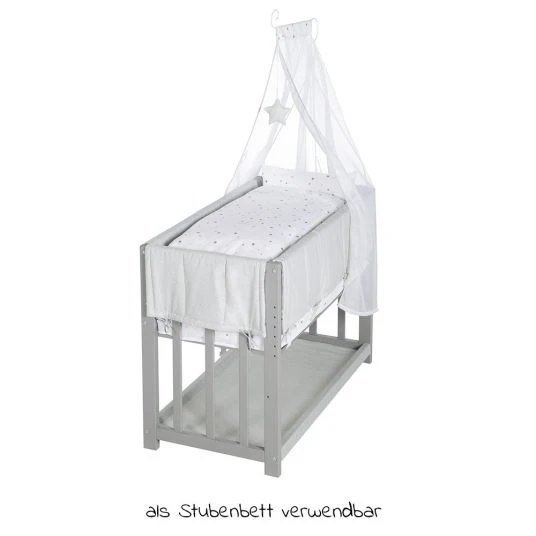 Zusätzlich zum 3 in 1 Stubenbett ist noch einiges an Zubehör im Lieferumfang enthalten: eine Matratze, eine Himmelstange, ein hübscher Himmel, ein gepolsterter Einhang, Kopfkissen (Inlett), Decke (Inlett) und ein 2 tlg. Bettwäsche-Set im Design Sternenzauber Grau sorgen für traumhafte Stunden. So schläft Dein Baby von Anfang an in einer wohligen, kuscheligen Umgebung.