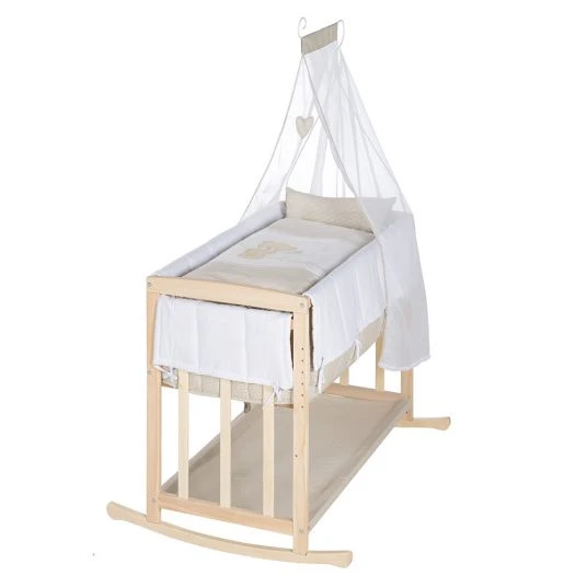 Zusätzlich zum 4 in 1 Stubenbett ist noch einiges an Zubehör im Lieferumfang enthalten: eine Matratze, eine Himmelstange, ein hübscher Himmel, ein gepolsterter Einhang, Kopfkissen (Inlett), Decke (Inlett) und ein 2 tlg. Bettwäsche-Set im Design Liebhabär sorgen für traumhafte Stunden. So schläft Dein Baby von Anfang an in einer wohligen, kuscheligen Umgebung.