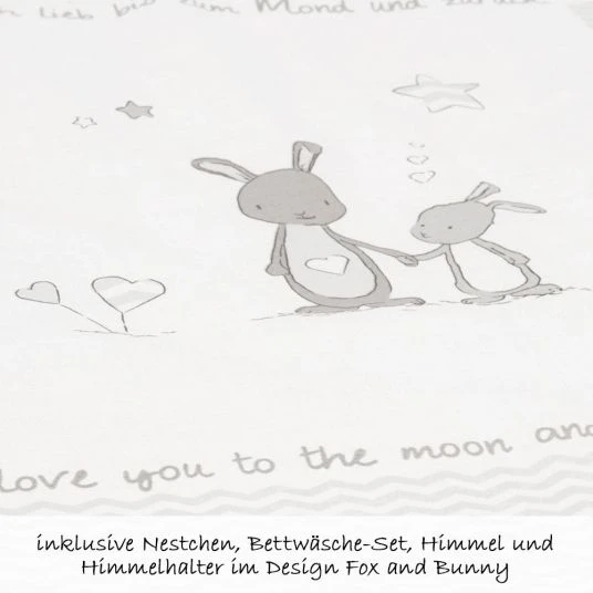 Mit dabei in diesem tollen Komplett-Set sind außerdem eine antiallergische Matratze mit abnehmbaren Bezug, ein Himmelhalter und ein Himmel mit Spielelement. Zusätzlich dazu sind ein gepolstertes Nestchen und ein Bettbezüge-Set im niedlichen Design Fox & Bunny im Lieferumfang enthalten.