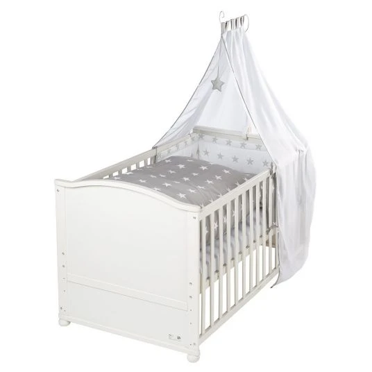 Mit dabei in diesem tollen Komplett-Set sind außerdem eine antiallergische Matratze mit abnehmbaren Bezug, ein Himmelhalter und ein Himmel mit Spielelement. Zusätzlich dazu sind ein gepolstertes Nestchen und ein Bettbezüge-Set im niedlichen Design Little Stars im Lieferumfang enthalten.