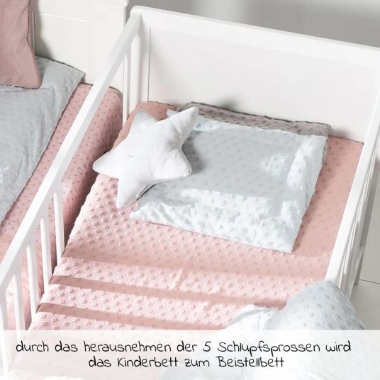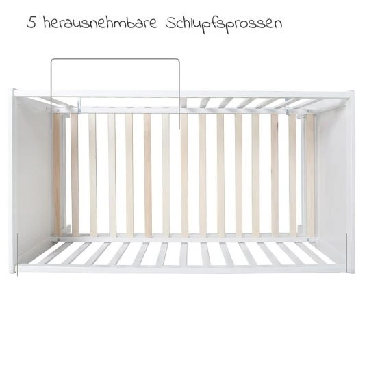 Das Beistellbett und Kinderbett Hamburg Weiß von Roba ist als Beistellbett zum Elternbett und als Baby- und Kinderbett verwendbar. Durch die 5 herausnehmbaren Schlupfsprossen ist es ab Geburt als Beistellbett verwendbar. Später erleichtern die Schlupfsprossen im Kinderbett das selbständige Ein- und Aussteigen Deines Kindes.