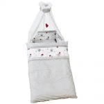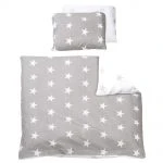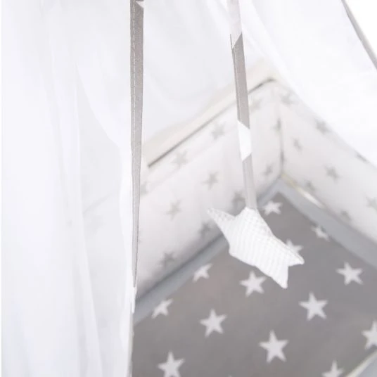 Das Bettwäsche-Set Little Stars von Roba verwandelt Ihr Kinderbett in eine hübsche Kuschel-Oase, die kleine Schlafmützen zum Träumen einlädt. Das Set besteht aus einer zweiteiligen Bettwäsche (Decken- und Kissenbezug), einem Nestchen und einem Himmel mit Spielelement. Das weiche Nestchen dient zur Polsterung der Gitterstäbe und wird einfach mit Bändern am Kinder-Bett befestigt. Der romantische, leicht transparente Himmel wird an einer separat erhältlichen Himmelstange über dem Bett angebracht, schon sorgt er für ein wohliges Ambiente. Alle Teile des Sets sind aus Baumwolle, perfekt aufeinander abgestimmt und im schönen Sternen-Design gehalten.