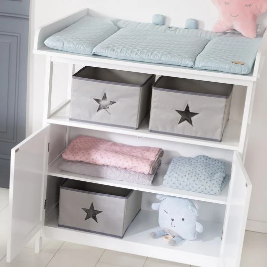 In den beiden Canvas-Boxen im offenen Fach zwischen der Wickelfläche und den 2 Türen hast Du bei der Babypflege alles schnell griffbereit. Hinter den beiden Türen mit modernen silbernen Griffen bietet sich Stauraum mit einem Einlegeboden für Wickelutensilien und Kleidungsstücke.