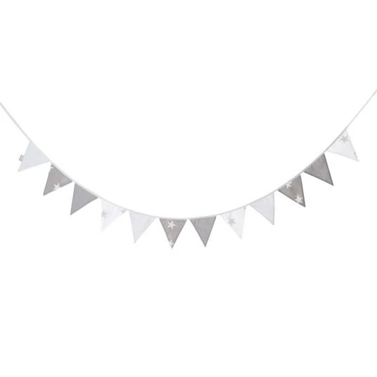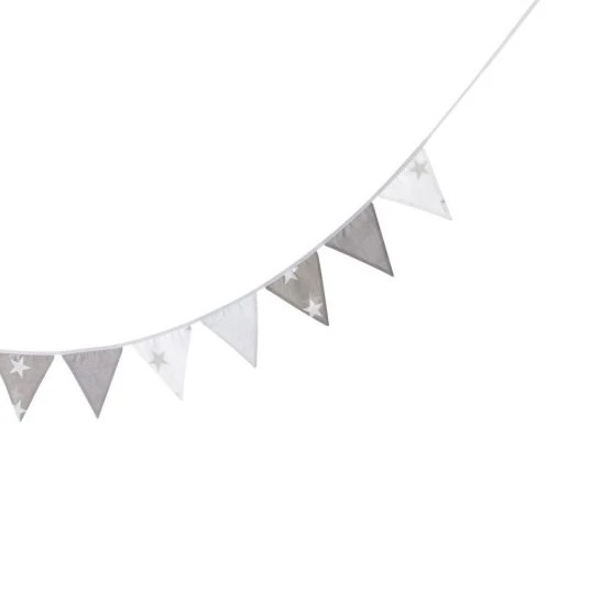 Die Wimpelkette Little Stars verleiht Ihrem Kinderzimmer das gewisse Etwas. Mit einer Länge von 3m kann sie durch den Raum, an die Wand oder über den Türrahmen gehängt werden. Die Wimpel sind 16 cm groß, in Grau und Weiß gehalten und mit trendigen Sternen verziert.