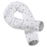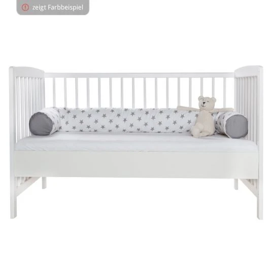 Die Baby-Nestchenrolle / Bettschlange – Big Stars Mint von Schardt umrandet jedes Kinderbettchen kuschelig weich. Mit ihren 180 cm Längen kann sie vielseitig eingesetzt werden. Der hübsch bedruckte Stoff besteht aus reiner, hautfreundlicher Baumwolle. Dank flauschiger Flockenfüllung polstert das flexible Nestchen das Gitterbett, den Laufstall und die Wiege weich ab.