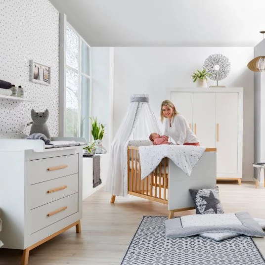 Das 16-teilige Kinderzimmer Miami White von Schardt besticht mit skandinavischem Design in seidenmattem Weiß und Massivholzelementen aus Buche. Besondere Hingucker sind die Füße, Möbelgriffe und Gitterseiten aus massivem und geöltem Buchenholz. Diese bilden einen schönen Kontrast zu den weißen Melamin Fronten. Das Set besteht aus einem 3-türigen, geräumigen Kleiderschrank, einem Kinderbett mit Umbauseiten, einer Wickelkommode, einem Wandboard, 2-tlg Bettwäsche, einem Nestchen, einem Kopfkissen, einer Bettdecke, einer Matratze, einem Spannbetttuch, einem Himmel, einer Himmelstange, einer Wickelauflage und zwei Umbauseiten für das Babybett. Die Wickelkommode lässt sich dank abnehmbarer Wickelauflage später auch als praktisches und schickes Sideboard verwenden.