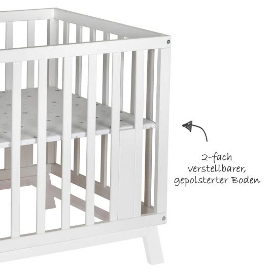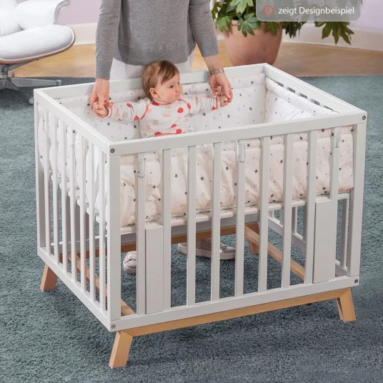 Im modernen 75 x 100 cm Laufgitter Holly Weiß – Sternchen Grau von Schardt kann Dein Baby sicher spielen, kuscheln und schlummern. Der Laufstall besteht aus massivem Buchenholz und ist dadurch besonders stabil und hält auch wilden Tobereien stand. Der weich gepolsterte Boden ist mit einer pflegeleichten Folie im Design Sternchen überzogen. Je nach Alter Deines Babys kannst Du den Boden des Laufgitters in 2 Positionen fixieren. Die oberste Stufe eignet sich für die ganz Kleinen. So kannst Du Deinen Liebling rückenschonend in das Laufgitter legen und genauso einfach wieder herausheben. Kann sich Dein Kind an den Gittern nach oben ziehen, stellst Du den Boden einfach tiefer.
