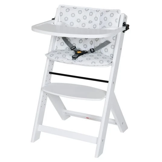 Die Kleinsten werden von einem weichen Sitzverkleinerer, einem 3-Punkt-Gurtsystem nach EU-Norm und einem abnehmbaren Schutzbügel gehalten. Auf dem gepolsterten Sitzverkleinerer im coolen Circle-Star-Design im harmonischen weiß-grau sitzt es sich besonders bequem. Ein praktisches Spielbrett bietet Platz für das Lieblingsspielzeug oder dient Dir als Ablage beim Füttern. So kannst Du das Gläschen einfach abstellen und hast einen kurzen Weg zum Mund. Später können Schutzbügel, Gurt und Brettchen einfach abgenommen werden, sodass auch größere Kinder den Stuhl problemlos nutzen können.