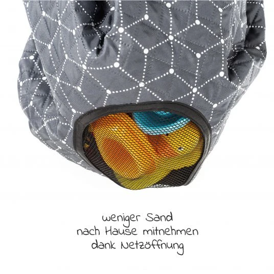 Besonders praktisch: Die Spielplatzdecke lässt sich auch als Tragetasche für Sandspielzeug nutzen. Der mittig angebrachte Netzstoff lässt den Sand hindurch, so dass Du diesen nicht mit nach Hause nimmst. Die Trageschlaufen machen das Mitnehmen besonders einfach, so kannst Du die Decke beispielsweise einfach an den Kinderwagen oder Buggy hängen. Wird sie nach einigen Spielplatz-Abenteuern schmutzig, kannst Du sie mit einer Maschinenwäsche bei 30°C wieder zum strahlen bringen.